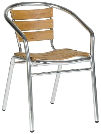 Aluminium stackable slatted chair with teak effect slats, when you want to sit and relax in the company of othrs simply pull up the chair and share.