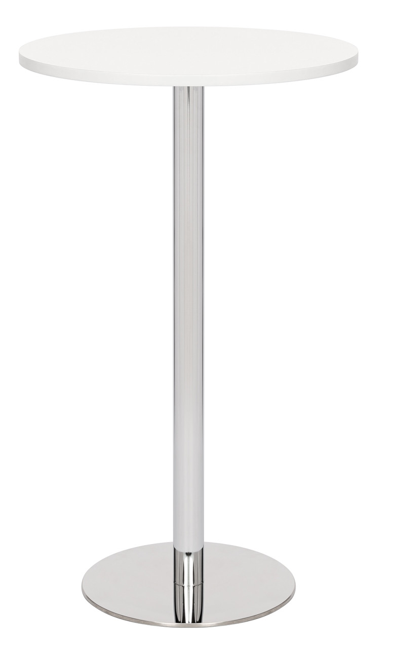 An elegant, functional Deluxe Eclipse Poseur Table with a high-quality white wooden top and mirror chrome frame, perfect for contemporary spaces.