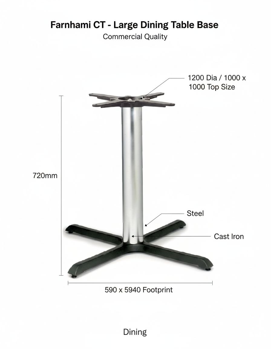 The Farnhami CT Large Dining Table Base is a commercial quality steel and cast iron support. Features a 590 x 590mm footprint and 720mm height, perfect for 1200mm diameter or 1000mm square tops.