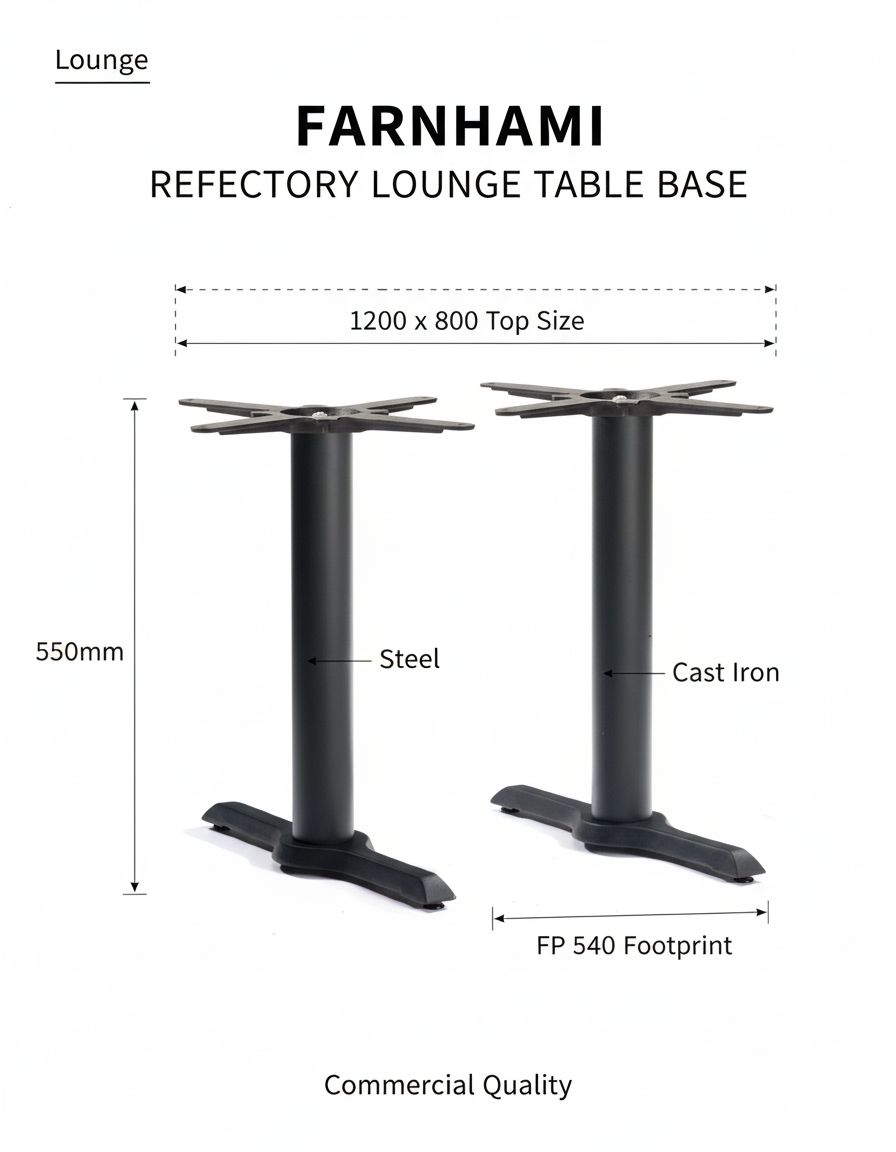 The Farnhami Refectory Lounge Table Base is a commercial-quality solution for lounge environments. Featuring a robust steel and cast iron construction with a 540mm footprint, it supports tops up to 1200 x 800mm. Height is 550mm for low-level comfort.
