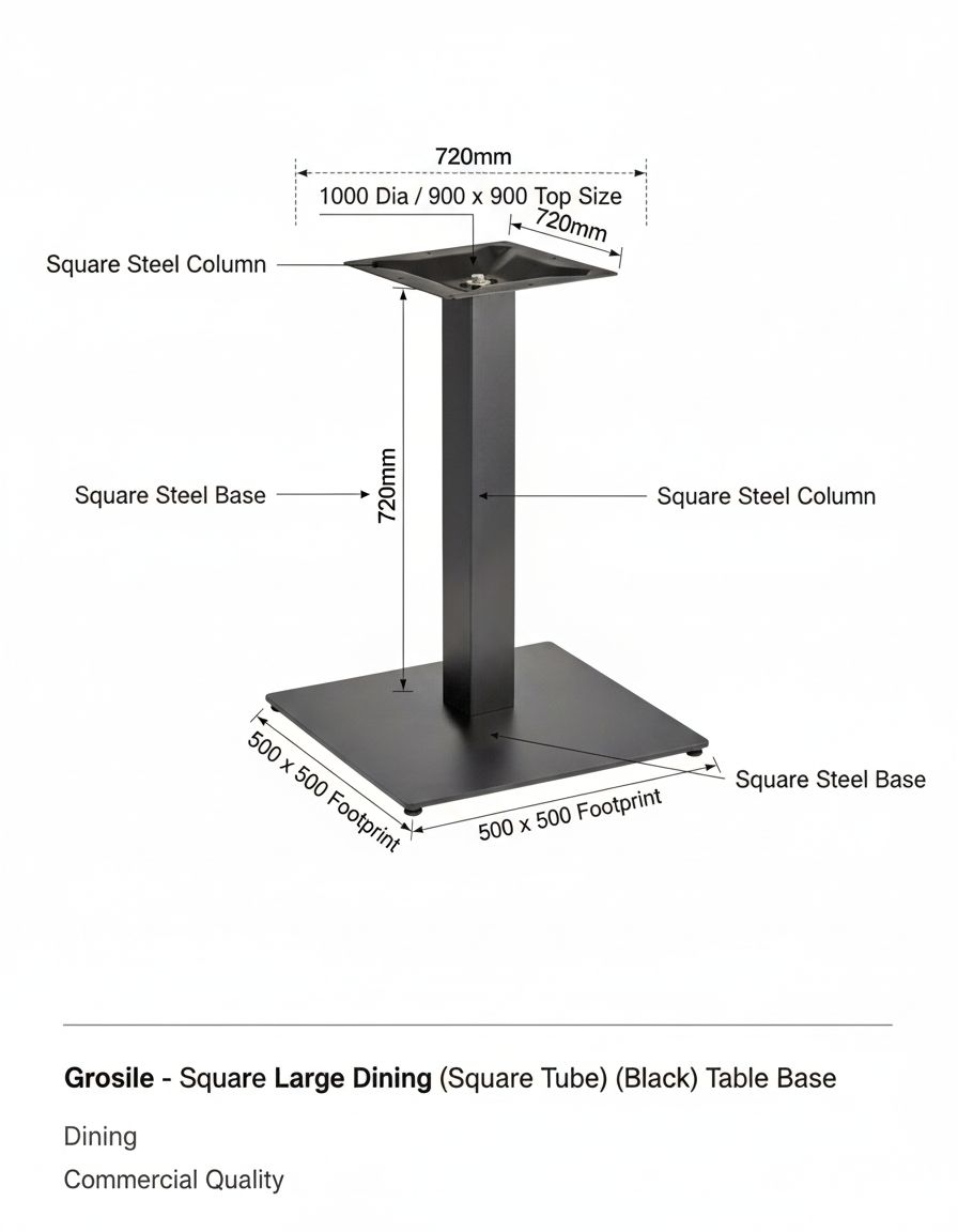 Upgrade your space with the Grosile Black Square Dining Table Base. Features a 500x500mm footprint, square steel column, and EPC finish. Fits up to 1000mm Dia tops. Commercial quality guaranteed.