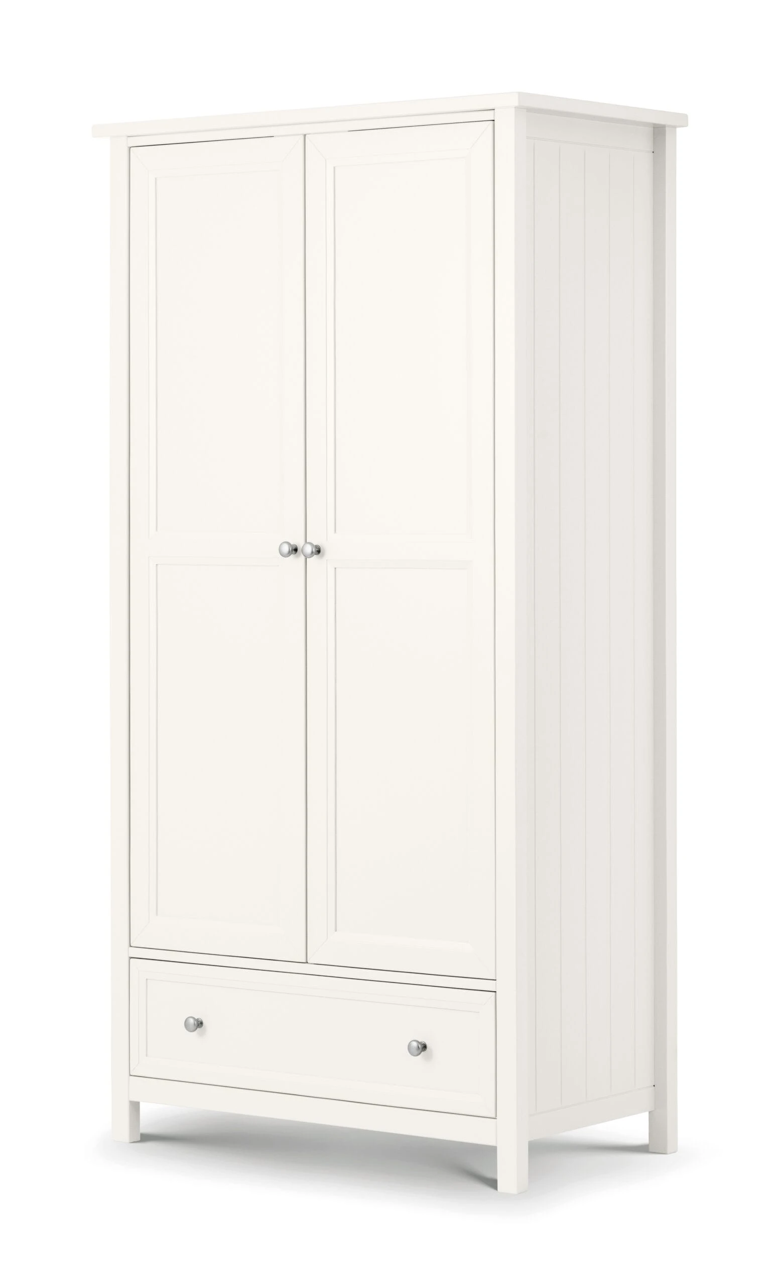 An elegant New England style wardrobe with two doors and one drawer. The combination of exquisite surf white lacquered finish with characteristic side panelling and detailed chamfered cabinetry makes for a soothing and refined aesthetic with timeless appeal, while delicate pewter handles add the perfect finishing touch.