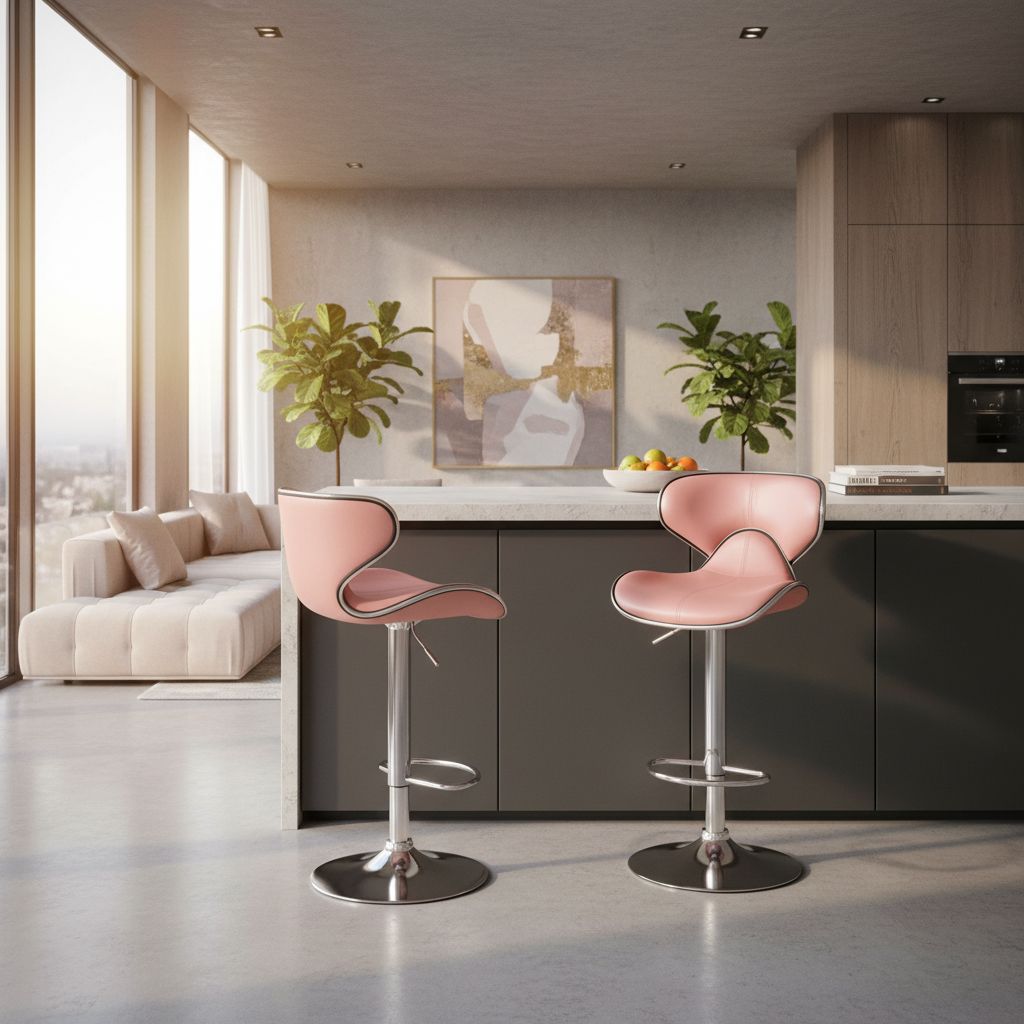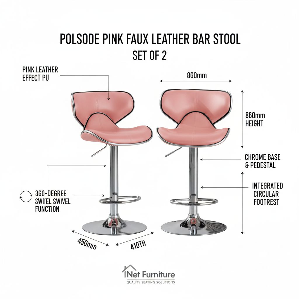 Upgrade your kitchen with this Pink Faux Leather Bar Stool set. Sold in pairs, these stools feature a chrome base, hydraulic lift, and dimensions of 450mm W x 410mm D x 860mm H. Durable leather effect PU finish.