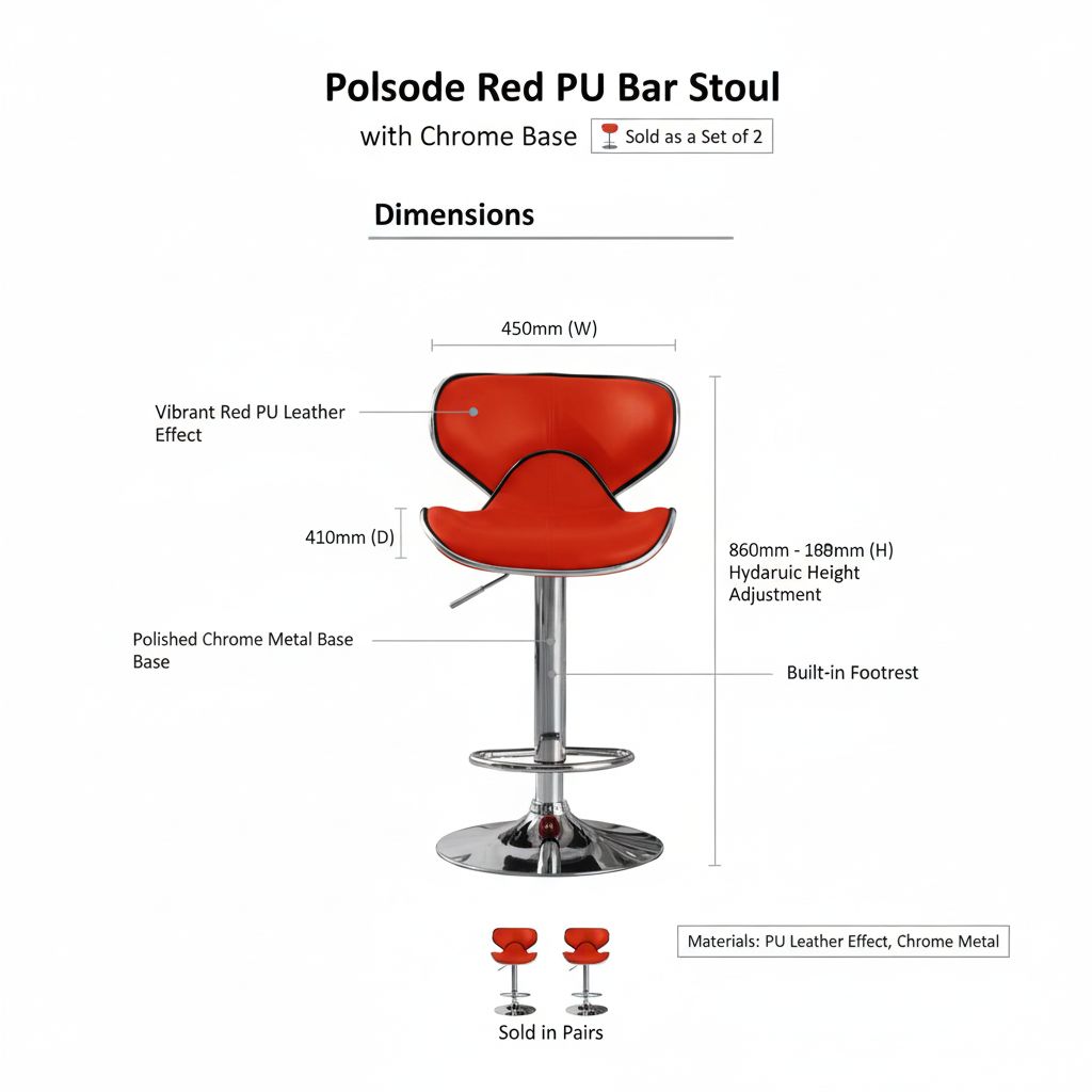 The Polsode Red PU Bar Stool set brings a bold, contemporary look to your kitchen. Sold in pairs, these stools feature a chrome base, leather effect finish, and hydraulic lift. Dimensions: 450W x 410D x 860-1080H mm.