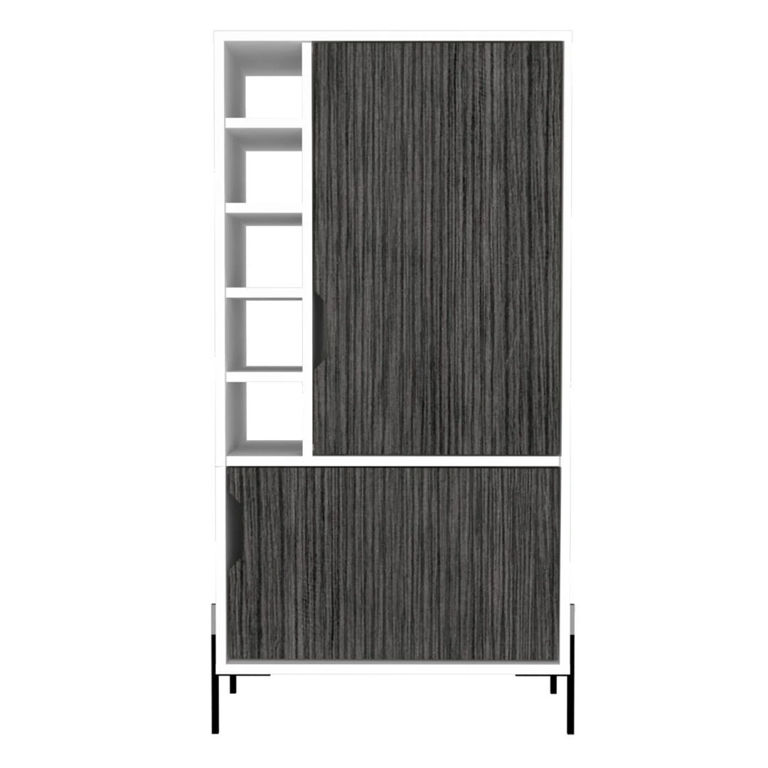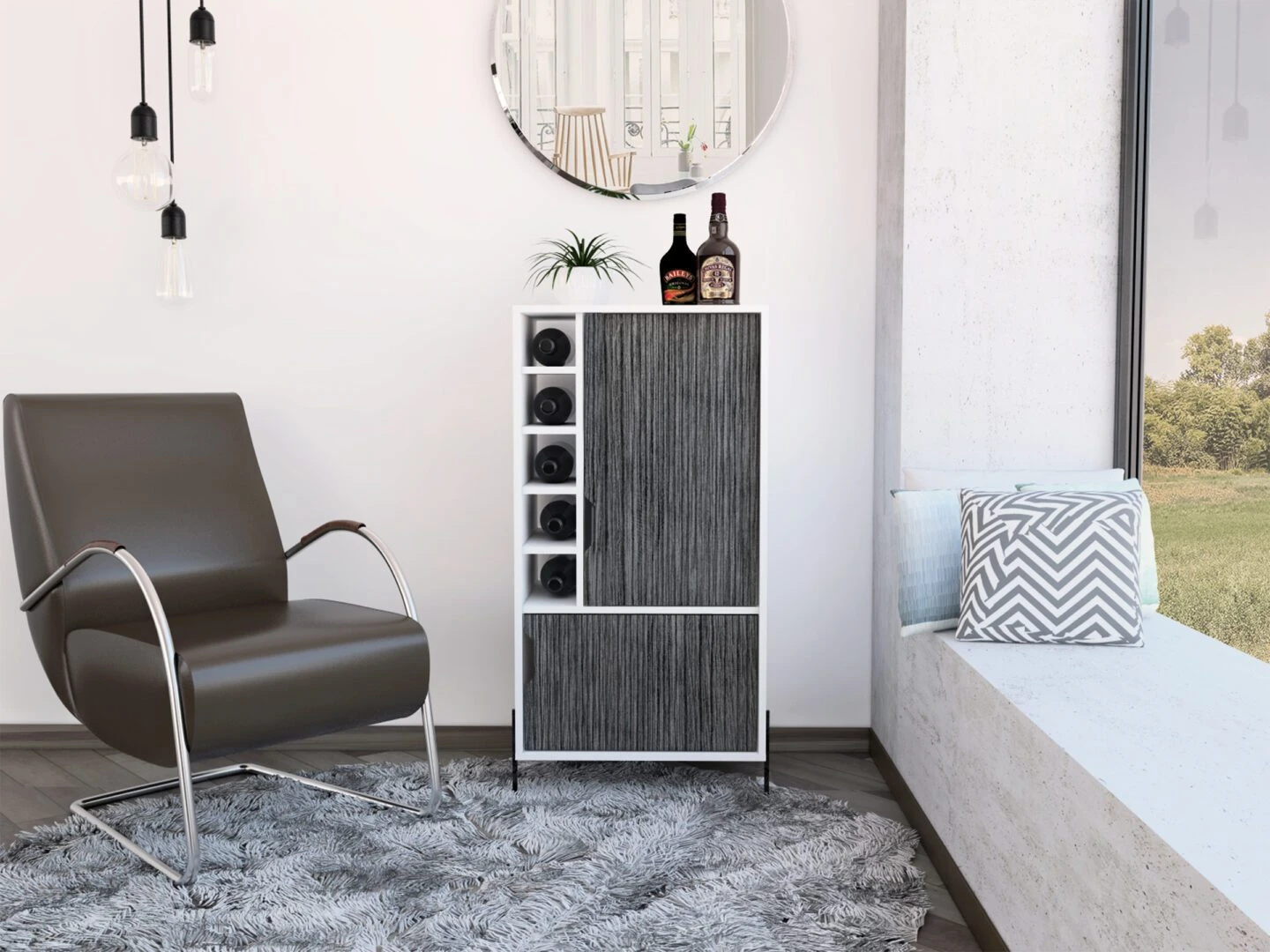 Our compact drinks bar offers plenty of shelving and storage for bottles and glassware, neatly hidden behind doors with no clutter cut out handles. Made in an easy to clean, hardwearing white and carbon grey oak effect melamine finish with real metal hardware.